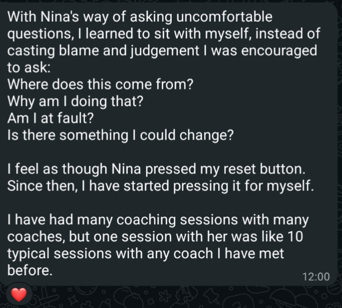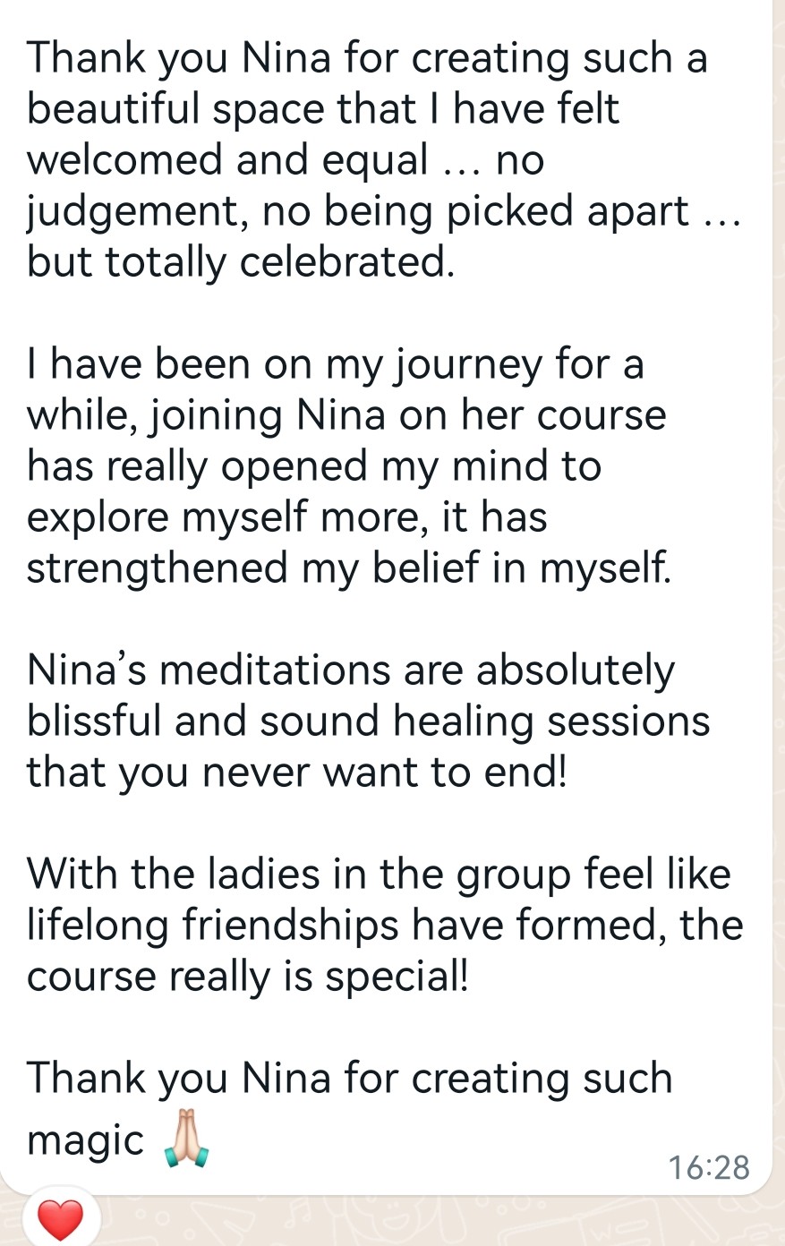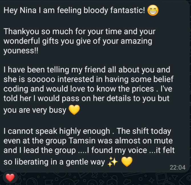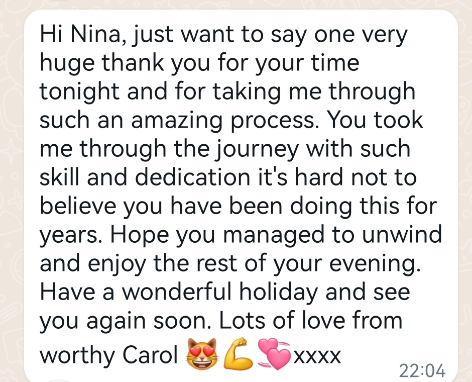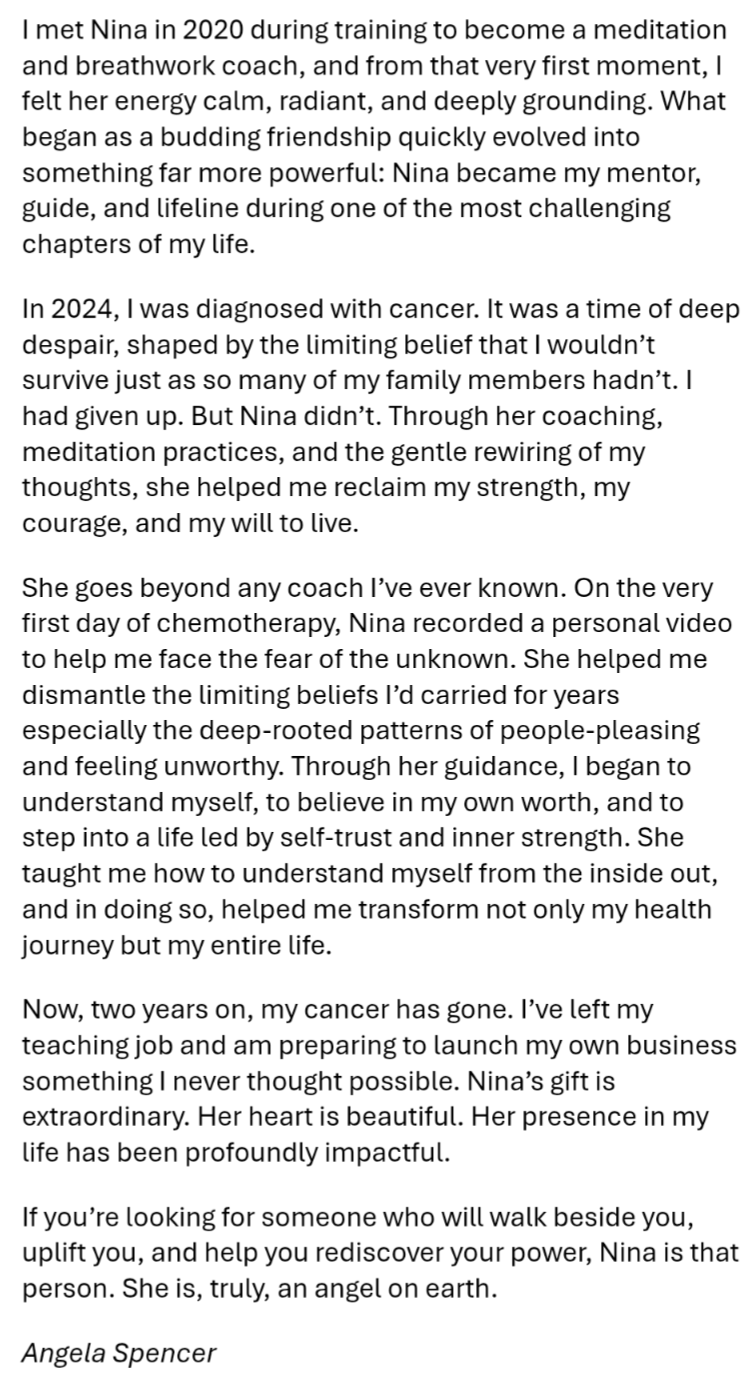 Clients say what stays with them isn’t only my teachings, it’s how deeply seen and safe they feel. They call me their “wise council,” their “fairy godmother,” their “Nina in my pocket,” and even “the little voice in their heart.”