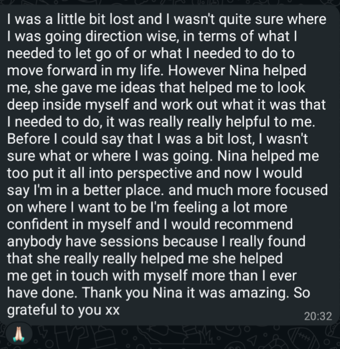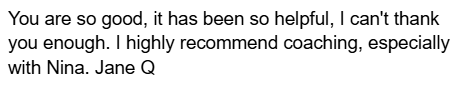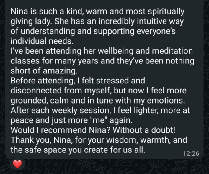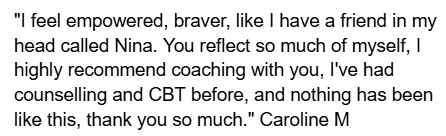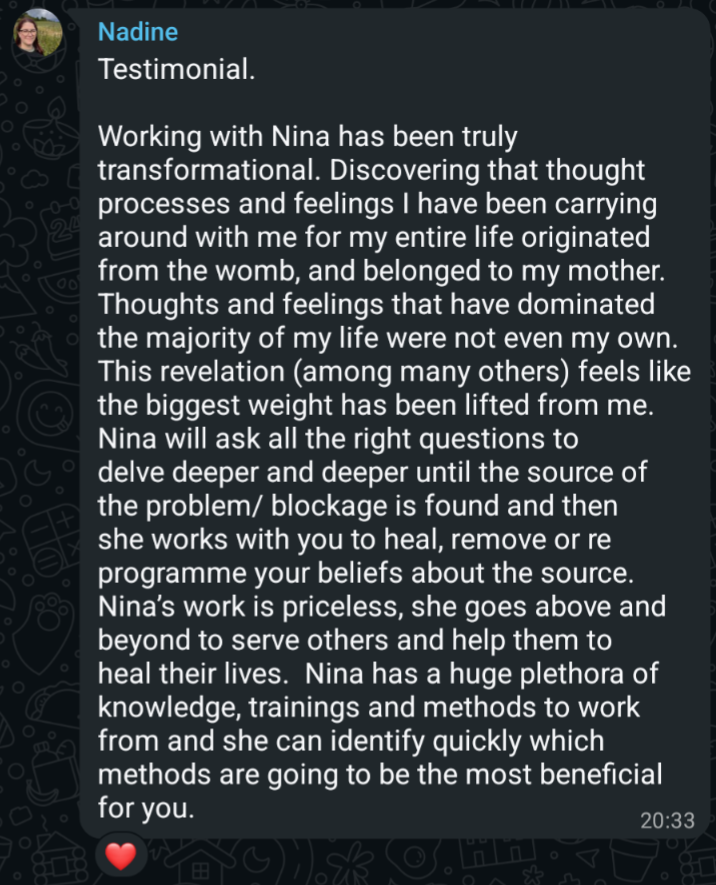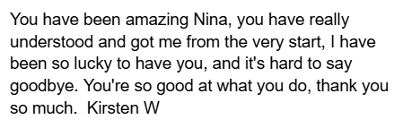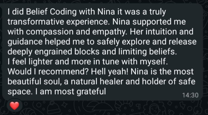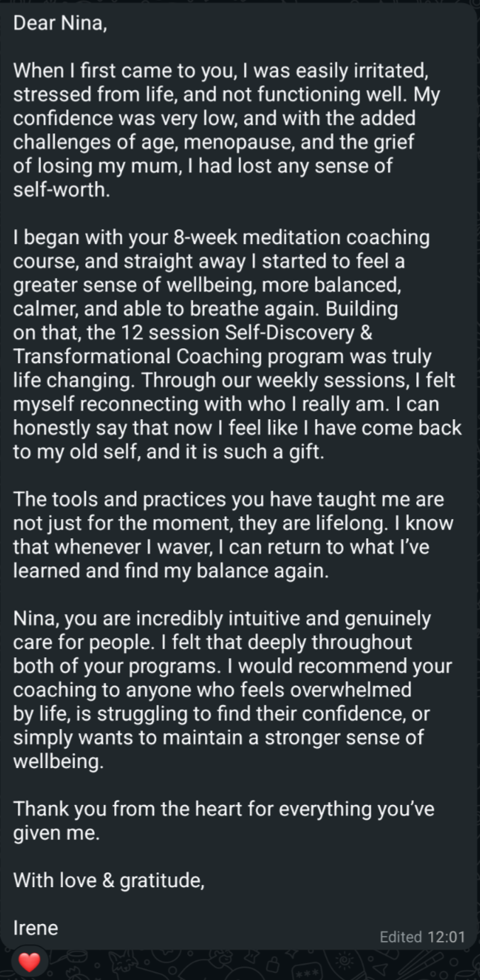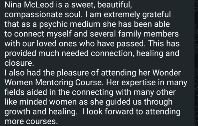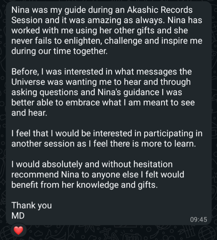 Clients say what stays with them isn’t only my teachings, it’s how deeply seen and safe they feel. They call me their “wise council,” their “fairy godmother,” their “Nina in my pocket,” and even “the little voice in their heart.”