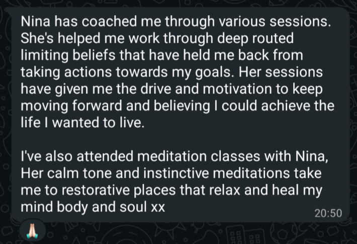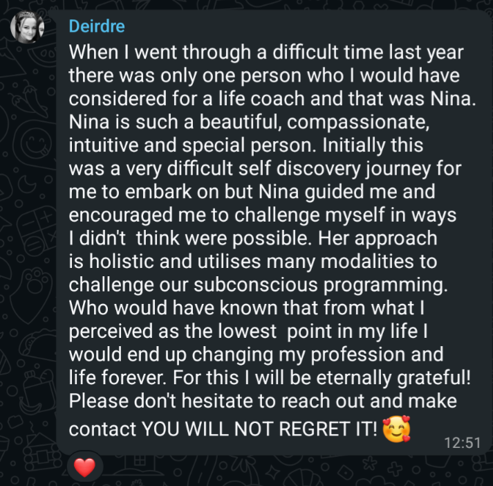 Hey, I’m Nina. A multi-accredited life coach, emotional therapist, and intuitive guide for soul-led women who are ready to return home to themselves. Through my signature journey, The 7-Step RETURNS Journey™, I guide women to reconnect with who they truly are beneath the roles, expectations, and emotional weight they’ve been carrying for too long. My work blends subconscious rewiring, nervous system regulation, intuitive guidance, and spiritual remembrance, a holistic inside-out path to transformation.